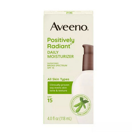 Aveeno Positively Radiant Daily Moisturizer with SPF 15 is a lightweight, non-greasy formula that helps to improve your skin's tone and texture. Infused with total soy complex, it works to enhance your skin's natural radiance while providing broad-spectrum sun protection. This moisturizer helps to hydrate your skin, making it feel soft and smooth, while actively reducing the appearance of dark spots and discoloration for a more even skin tone over time.